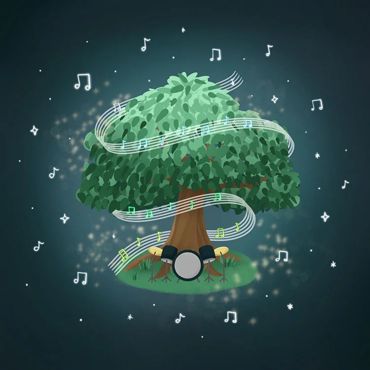Each image was inspired by the botanical garden: Musical Frog Pond captures the vivacity of pond life, Singing Tree depicts a concert setting in an oak tree grove at night, and Raccoon Playing Guitar highlights summer florals and California natives.